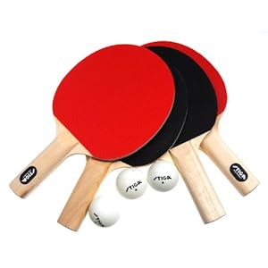 Set of four hardbat-style table tennis rackets Also includes three white, 40-millimeter, one-star table tennis balls Ideal for recreational and family play Pips-out surface for better ball contact, slower shots, and more strategic game Straight handles; 5-ply blades